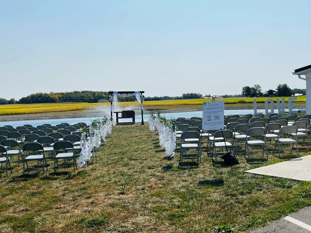 Outdoor wedding ceremony space overlooking a 3/4 Acre pond with beach area . Our pond fountain can be changed to different colors to match your event.